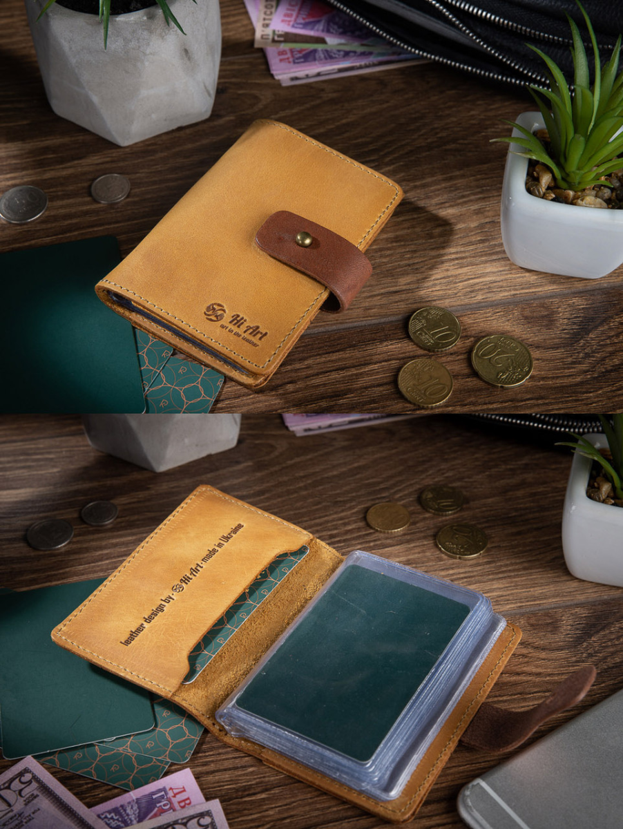 Оригінальний картхолдер із натуральної шкіри на кобурному гвинті світло-жовтого кольору