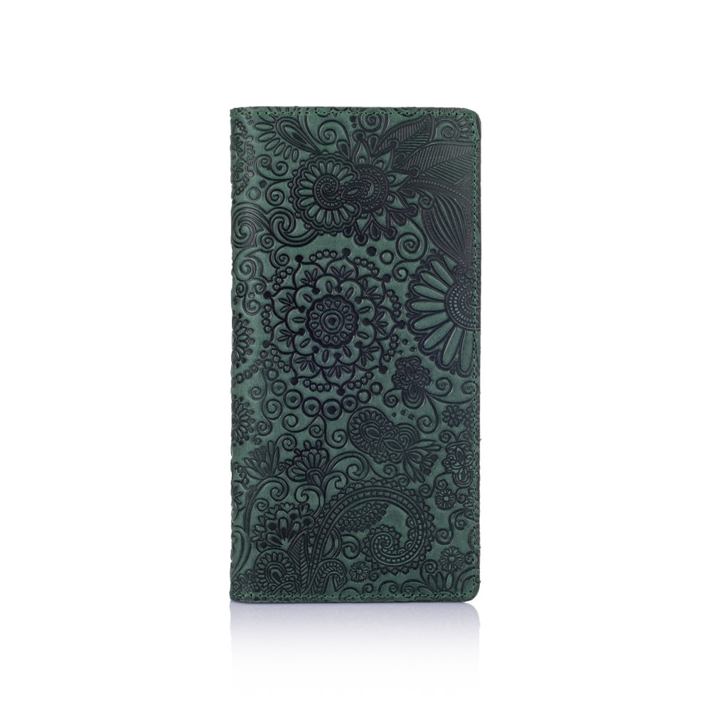 Дизайнерський шкіряний гаманець зеленого кольору на кнопках з відділенням для монет, колекція "Mehendi Art"